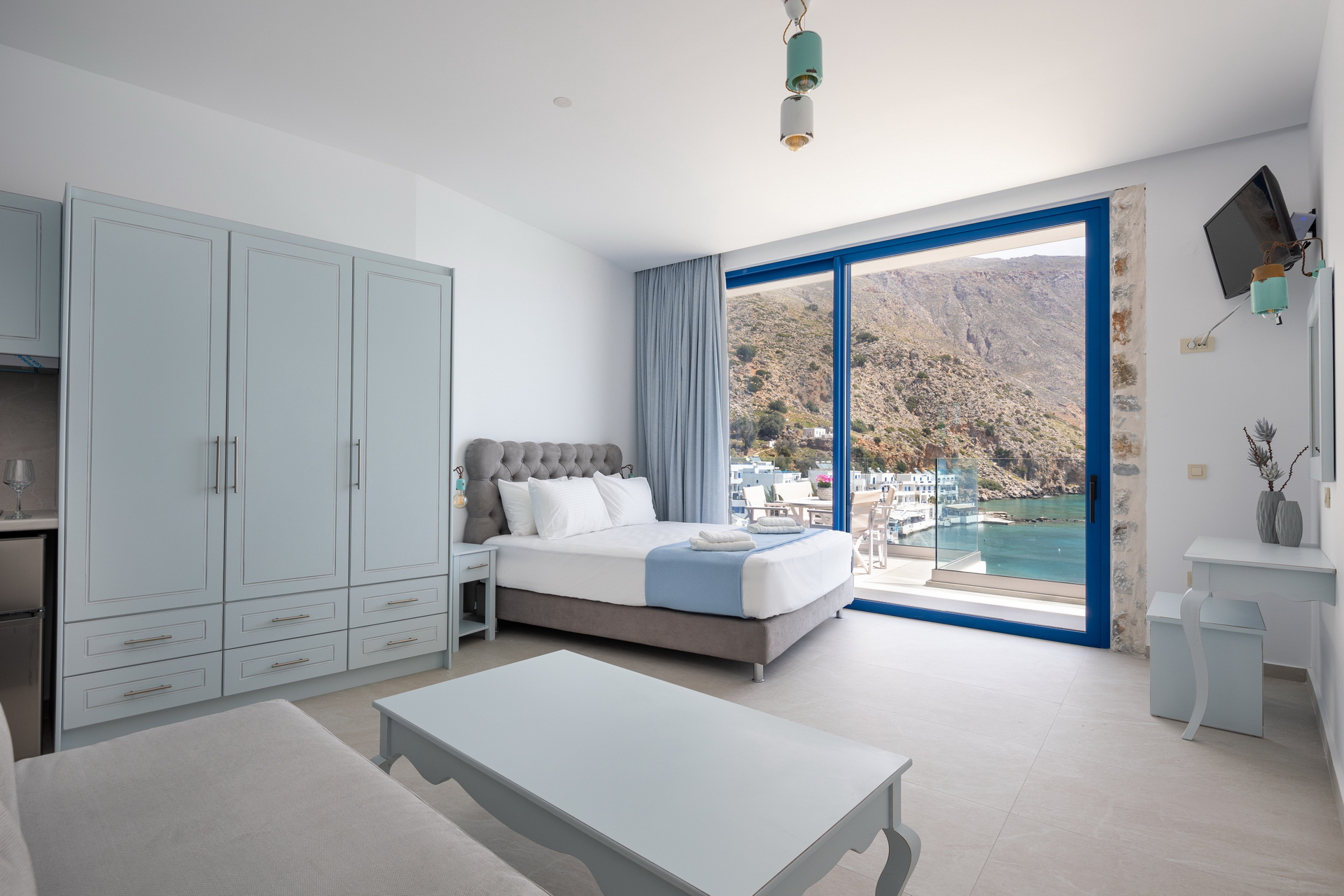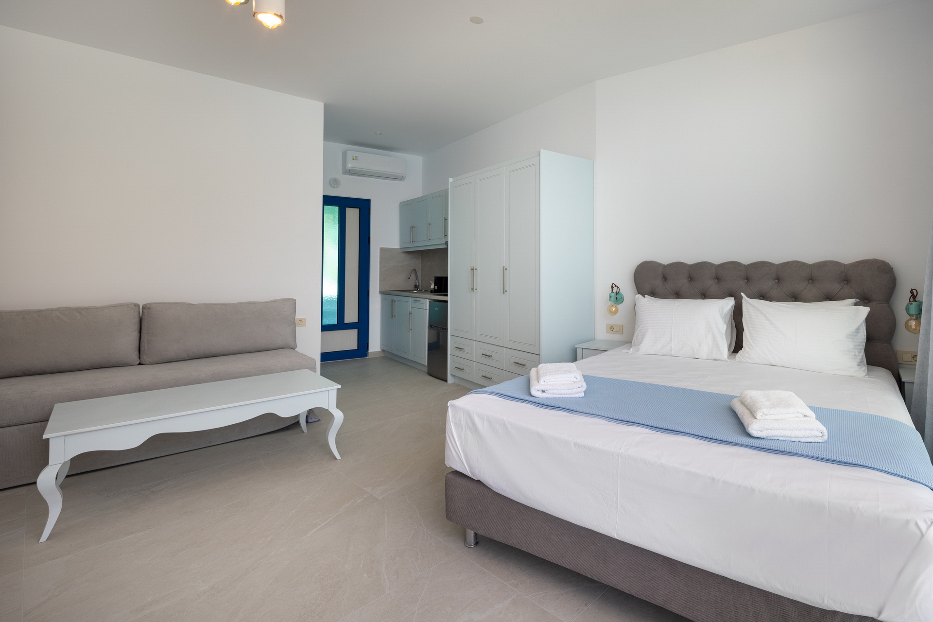 “Maistrali” apartment is located at the third floor of the new complex and can accommodate up to 4 persons. It consists of a bedroom with a double bed, a sofa bed, a fully equipped kitchen with cooking utensils, kitchen stoves, fridge, boiler, coffeemaker and a private bathroom. Moreover, the apartment has a wardrobe, safety box, satellite TV, air conditioning, WiFi, hair dryer and balcony with sea view.