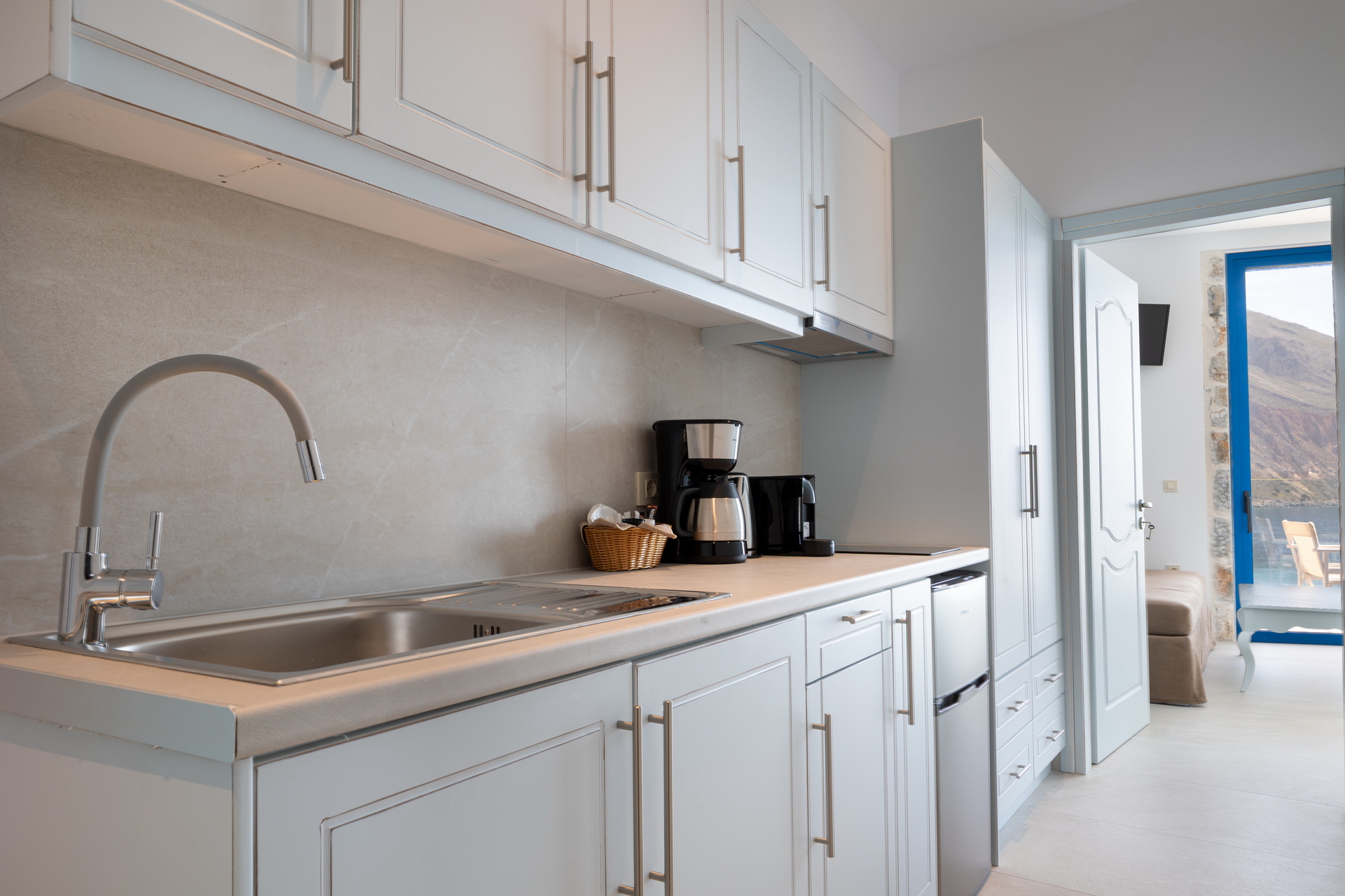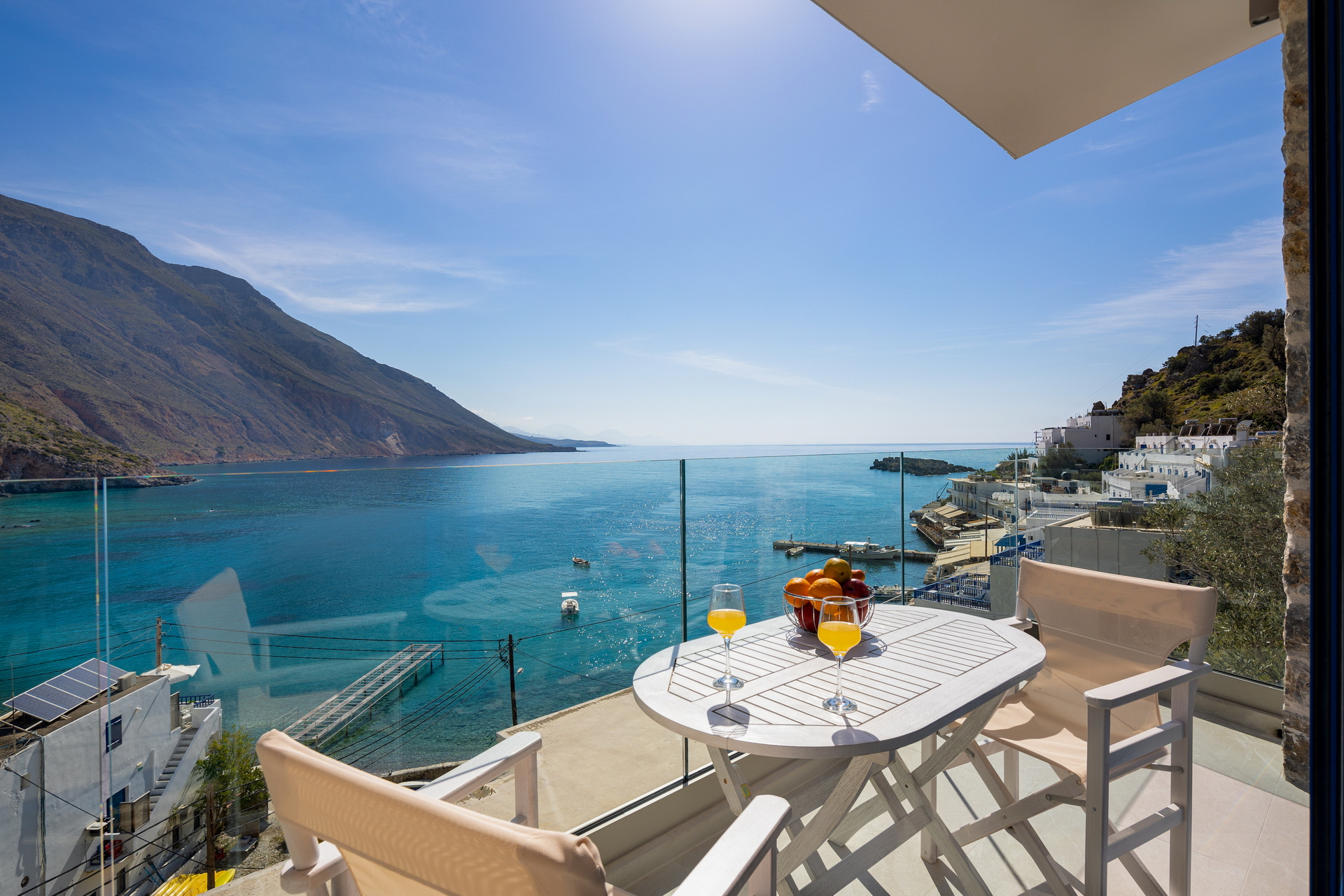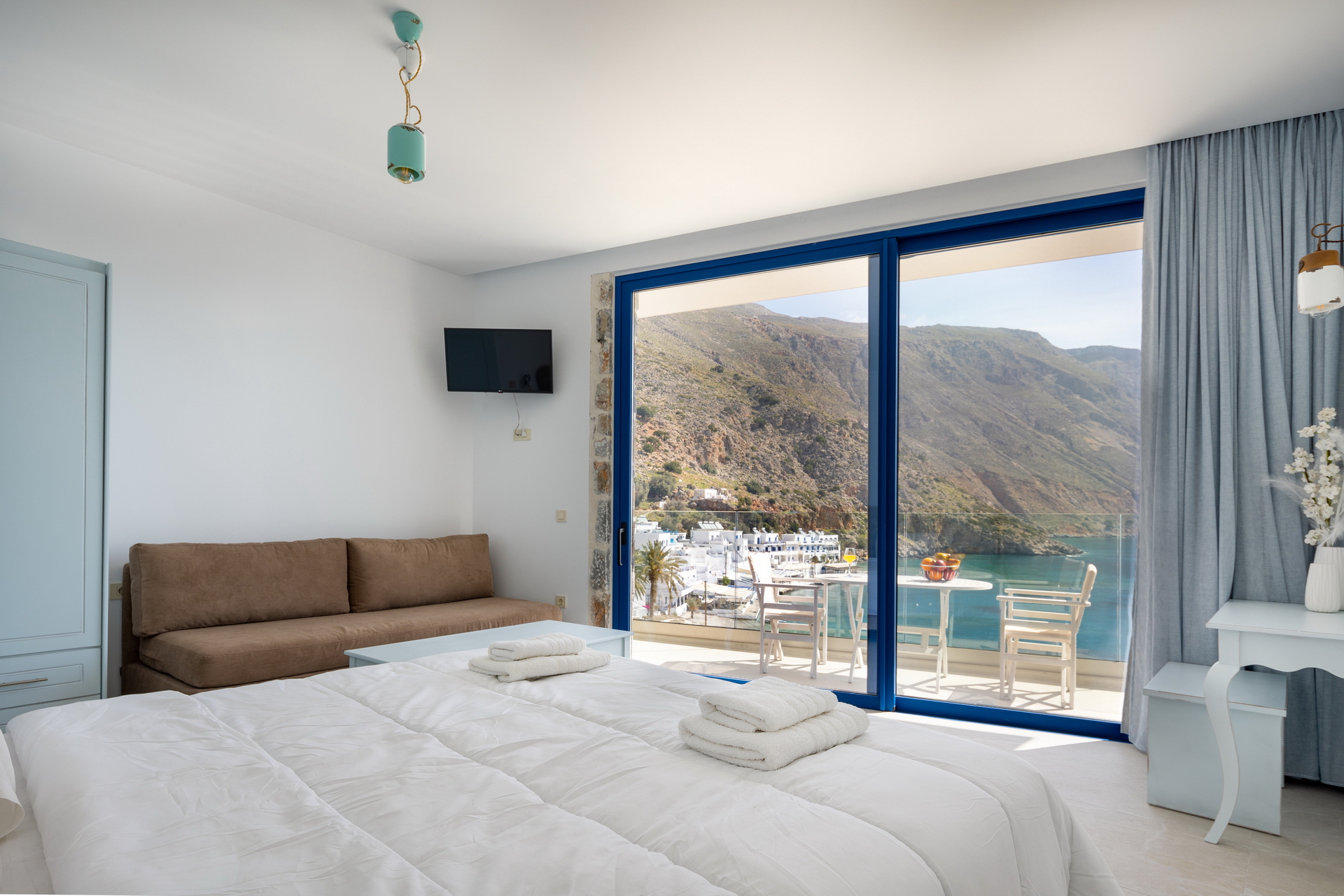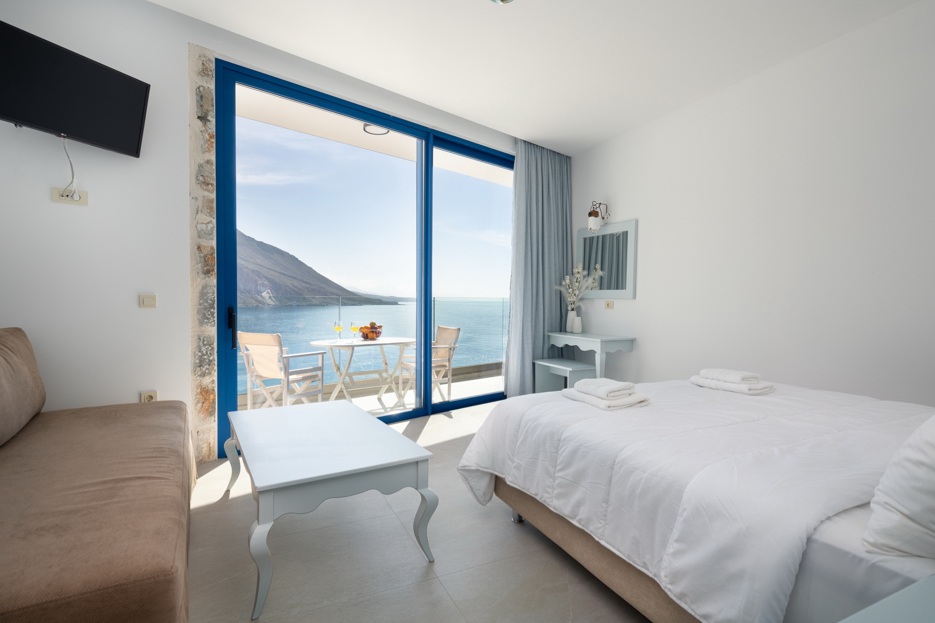 “Meltemi” apartment is located at the third floor of the new complex and can accommodate up to 6 persons. It consists of two bedrooms with double beds, a sofa bed, a fully equipped kitchen with cooking utensils, kitchen stoves, fridge, boiler, coffeemaker and a private bathroom. Moreover, the apartment has a wardrobe, safety box, satellite TV, air conditioning, WiFi, hair dryer and balcony with sea view.
